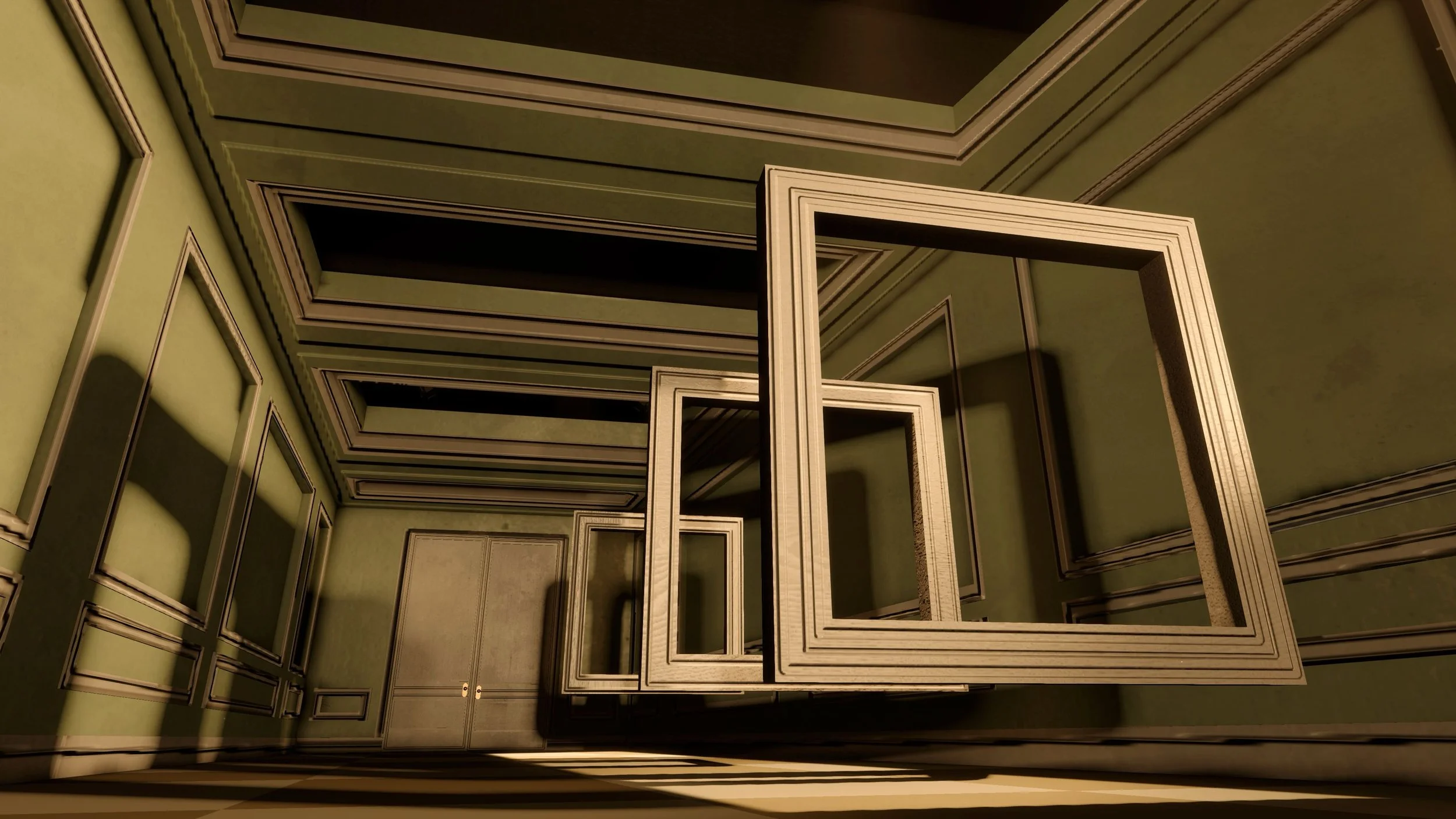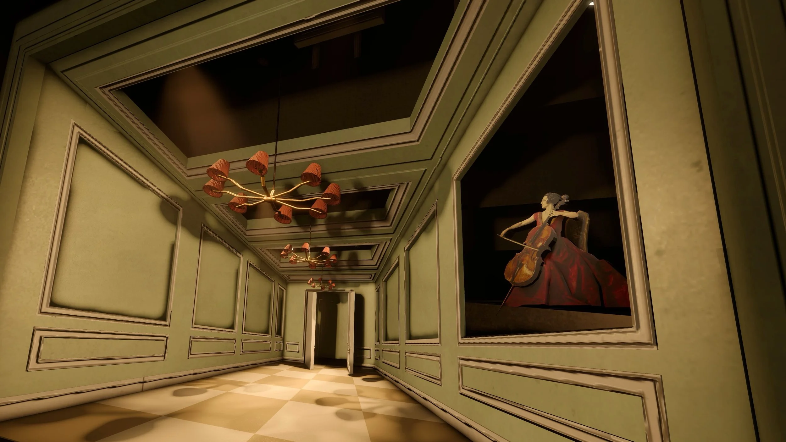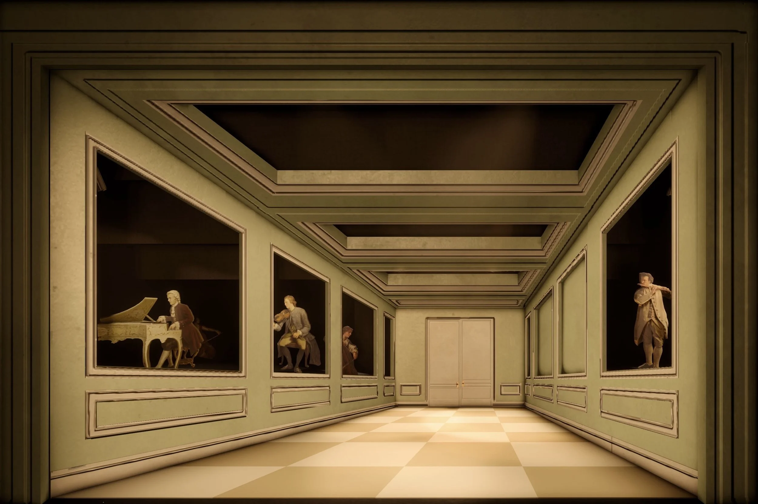 Baroque instruments and musicians are revealed within the walls of an atemporal palace corridor.